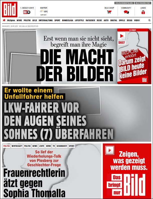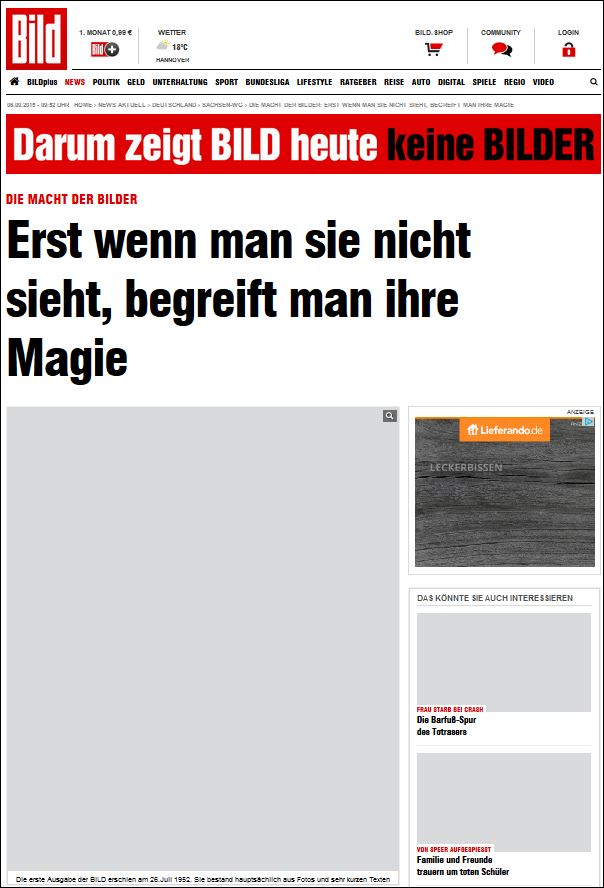 Χωρίς φωτογραφίες κυκλοφορεί σήμερα η γερμανική εφημερίδα Bild, τόσο η έντυπη όσο και η ηλεκτρονική έκδοσή της.