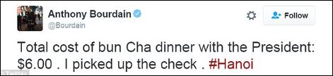 Μετά το γεύμα, ο Μπουρντέν έγραψε στο Twitter ότι ο λογαριασμός ήταν μόλις 6 δολάρια και τον πλήρωσε ο ίδιος, κερνώντας το γεύμα στον Ομπάμα.