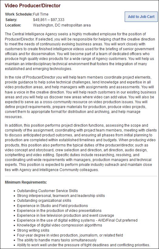 Η CIA αναζητεί μέσω αγγελίας παραγωγό – σκηνοθέτη για πλήρη απασχόληση και με μισθό από 49.681 έως 97.333 δολάρια. Αντικείμενο του θα είναι η παραγωγή βίντεο για την Κεντρική Υπηρεσία Πληροφοριών των ΗΠΑ. Μερικά από τα προσόντα που πρέπει να είναι:
