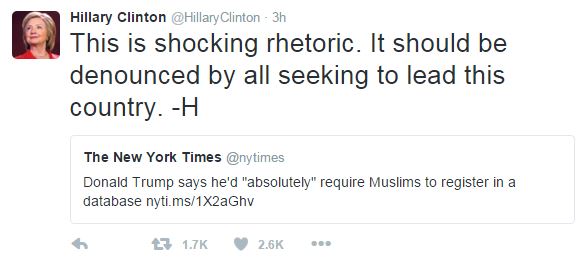 «Πρόκειται για μια σοκαριστική ρητορική» απάντησε σήμερα το φαβορί για το χρίσμα των Δημοκρατικών, η Χίλαρι Κλίντον με ανάρτησή της στον λογαριασμό στον ιστότοπο κοινωνικής δικτύωσης Twitter.