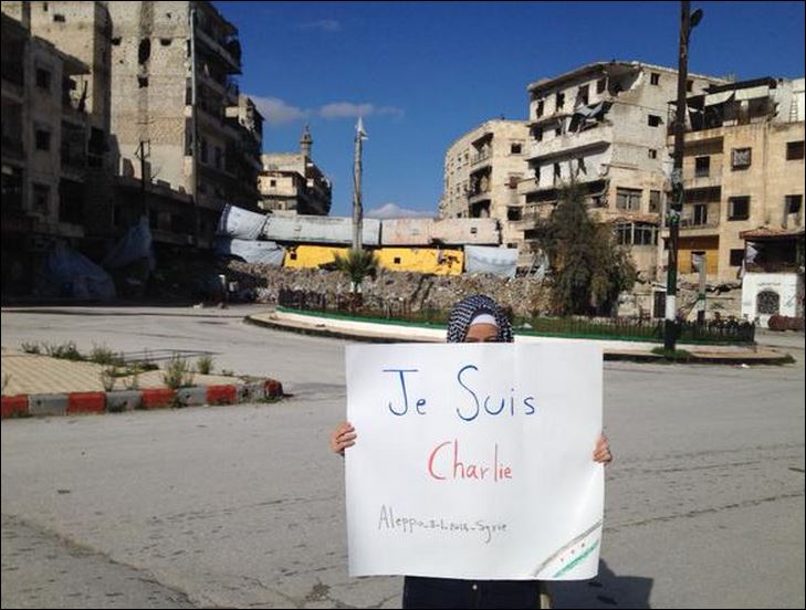 Στη φωτογραφία της δημοσιογράφου από τη Συρία, Ζάινα Ερχαΐμ, που υψώνει ένα πλακάτ μέσα από τα ερείπια του Χαλεπίου, με το σύνθημα “Είμαι και εγώ Charlie“, αναφέρθηκε ο πρόεδρος της Γαλλίας, Φρανσουά Ολάντ.