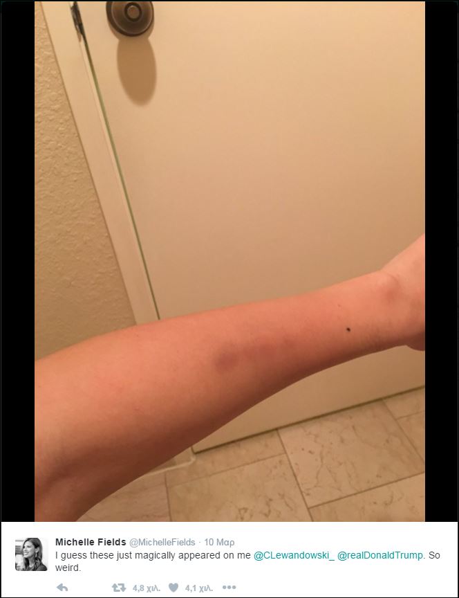 Συγκεκριμένα, η Μισέλ Φιλντς, ανέβασε τη φωτογραφία με τις μελανιές στο χέρι της στους προσωπικούς της λογαριασμούς στα μέσα κοινωνικής δικτύωσης, θέλοντας με αυτόν τον τρόπο να αποδείξει ότι όσα ισχυρίστηκε για την επίθεση που δέχθηκε από τον συνεργάτη του Τραμπ αληθεύει.