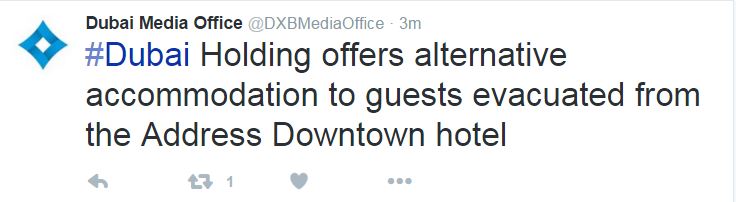 Σύμφωνα με το γραφείο τύπου του Ντουμπάι, η εταιρεία Dubai Holding θα μεριμνήσει για τη διαμονή των ενοίκων του ξενοδοχείου Address Downtown στο οποίο ξέσπασε πυρκαγιά.