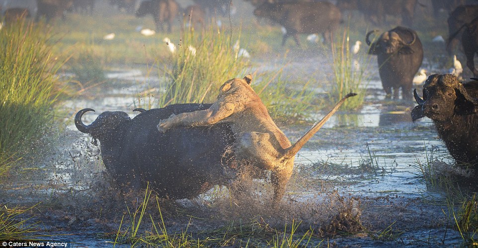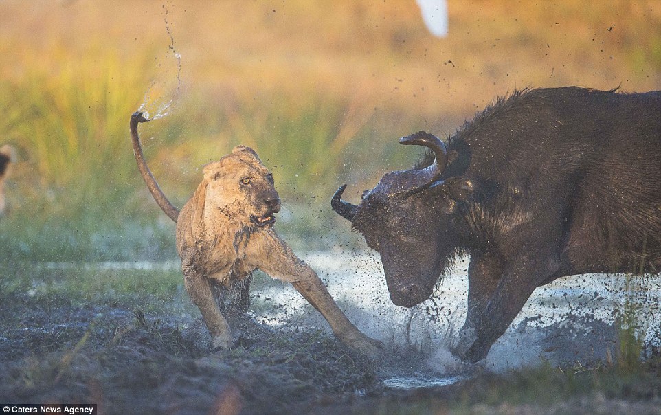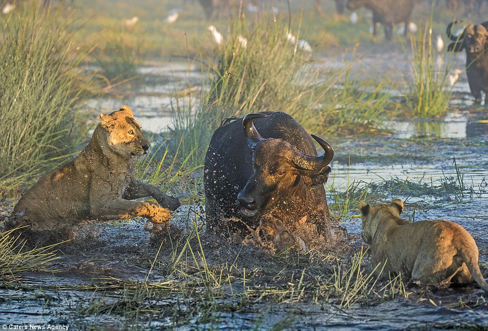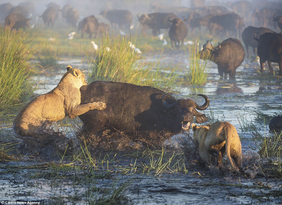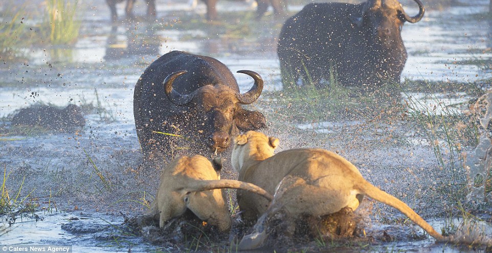 Στις εντυπωσιακές φωτογραφίες που ακολουθούν βλέπουμε την συγκλονιστική προσπάθεια ενός θηλυκού βουβαλιού να σώσει τα μικρά του από την επίθεση δυο λιονταριών. Δυο φωτογράφοι απαθανάτισαν το συγκινητικό στιγμιότυπο στο οποίο βλέπουμε την τεράστια δύναμη του μητρικού ενστίκτου στο ζωικό βασίλειο.