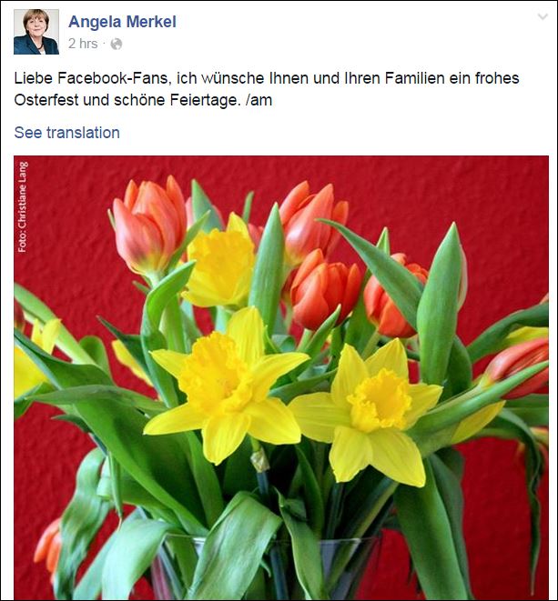 “Αγαπητοί φίλοι μου στο facebook, εύχομαι σε εσάς και τις οικογένειές σας καλό Πάσχα και καλές διακοπές” έγραψε απλά και… λιτά η καγκελάριος της Γερμανίας αναρτώντας και μία φωτογραφία με λουλούδια.