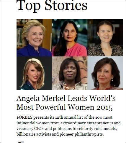 «Ανέλαβε τον Δεκέμβριο του 2014 μία τρίτη θητεία διάρκειας 4 ετών, επικεφαλής της πλέον δυναμικής οικονομίας της Ευρώπης και είναι η παλαιότερη αιρετή σε μία θέση της Ευρωπαϊκής Ένωσης» εξήγησε το Forbes, που υπογραμμίζει επίσης ότι η Γερμανίδα καγκελάριος «αντιμετώπισε με αποτελεσματικότητα μία ύφεση σε εθνικό επίπεδο κατά τη διάρκεια της παγκόσμιας οικονομικής κρίσης» και βρίσκεται «στο επίκεντρο των προσπαθειών με στόχο να βοηθήσει την Ελλάδα να επανεκκινήσει την οικονομία της».
