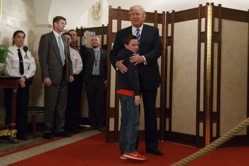 Ο Τραμπ, με στιλ που θύμισε είσοδο παρουσιαστή σόου σε στούντιο, αφού τους χαιρέτισε, κάλεσε τα παιδιά να έρθουν προς το μέρος του. Ωστόσο, μόνο ο 10χρονος Jack Cornish από την Αλαμπάμα το τόλμησε και πόζαρε δίπλα από τον Αμερικανό πρόεδρο. Ο Τραμπ του ψιθύρισε κάτι στο αυτί και στη συνέχεια τον αγκάλιασε.
