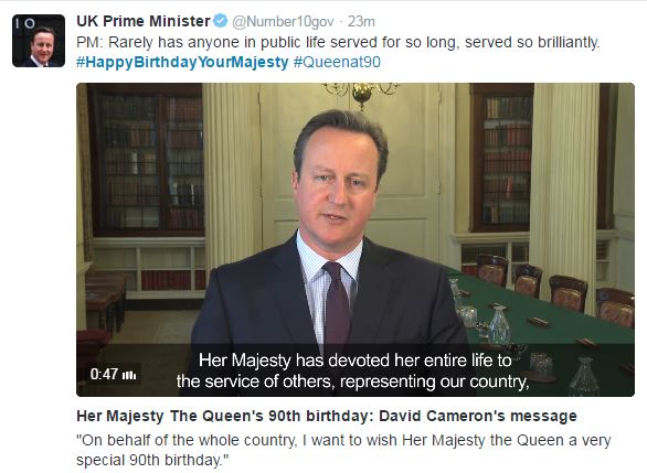 Ο Πρωθυπουργό της Αγγλίας, Ντέιβιντ Κάμερον της έδωσε εκ μέρους ολόκληρης της χώρας τις καλύτερες ευχές του για τα γενέθλια της.