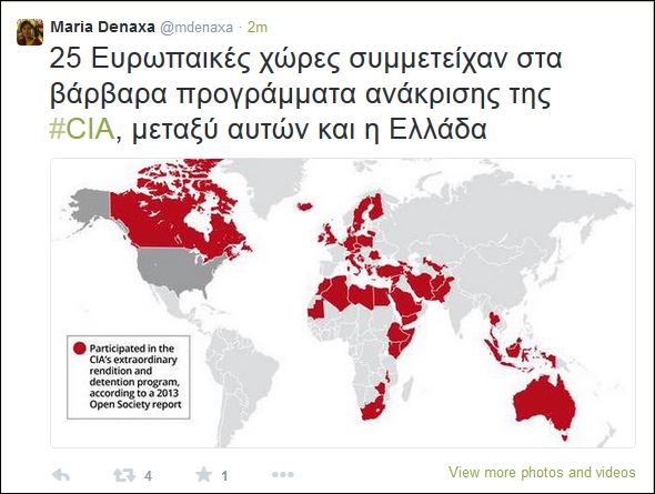 Όπως φαίνεται και στον χάρτη, ανάμεσα στις 25 Ευρωπαϊκές χώρες που συμμετείχαν στα βάρβαρα προγράμματα ανάκρισης της CIA, ήταν και η Ελλάδα.