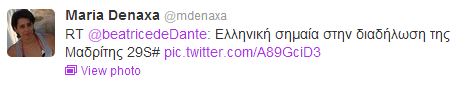 Οι Ισπανοί διαμαρτυρήθηκαν για τα μέτρα λιτότητας στη Μαδρίτη και κάποιος ανάμεσά τους σήκωσε μια ελληνική σημαία.Διαβάστε το tweet που έκανε retweet η Μαρία Δεναξά: