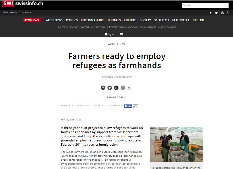 Συγκεκριμένα, η Ένωση Ελβετών Αγροτών και το υφυπουργείο Μετανάστευσης (SEM) τάχθηκαν υπέρ της απασχόλησης των προσφύγων και έτσι ξεκινάει πιλοτικό πρόγραμμα τριών ετών, με την πρόσληψη προσφύγων που θα εργαστούν σε αγροκτήματα.