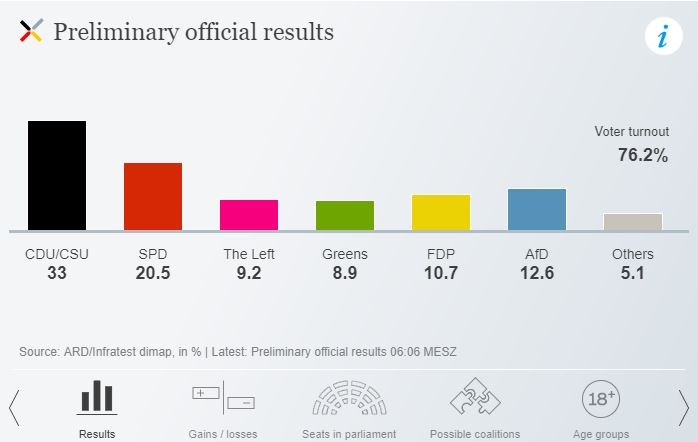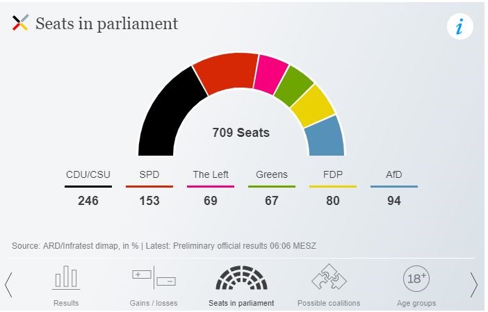 Όπως ανακοινώθηκε επισήμως, η κατανομή των εδρών στην Κάτω Βουλή του γερμανικού κοινοβουλίου, της Μπούντεσταγκ, έχει ως εξής: