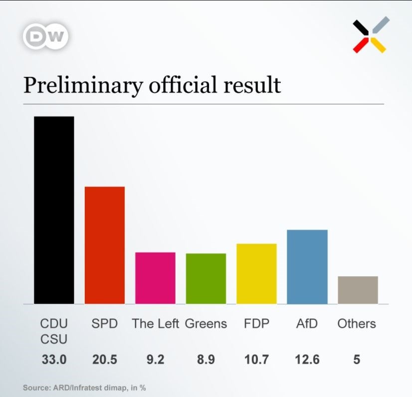 CDU/CSU 33% (2013:41,5%), SPD 20,5% (25,7%), AfD 12,6% (4,7%), FDP 10,7% (4,8%), Αριστερά 9,2% (8,6%), Πράσινοι 8,9% (8,4%).