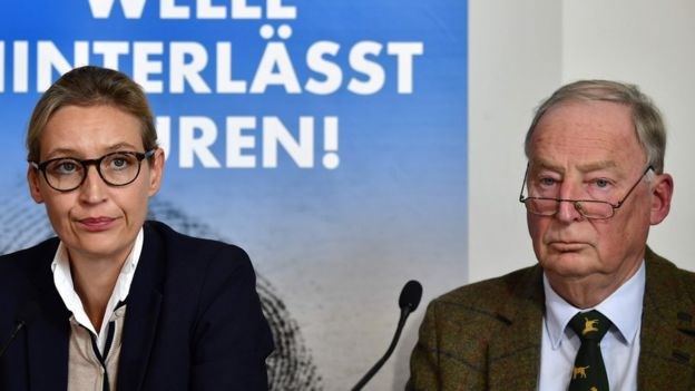 Στο ίδιο μήκος κύματος, ο Alexander Gauland είχε δηλώσει πως οι Γερμανοί θα έπρεπε να είναι υπερήφανοι για όσα έκαναν οι στρατιώτες τους κατά τη διάρκεια των δύο παγκοσμίων πολέμων, ξυπνώντας μνήμες των φρικαλεοτήτων του Δευτέρου Παγκοσμίου Πολέμου. Οι επικεφαλής της «Εναλλακτικής για τη Γερμανία», Alice Weidel και Alexander Gauland: