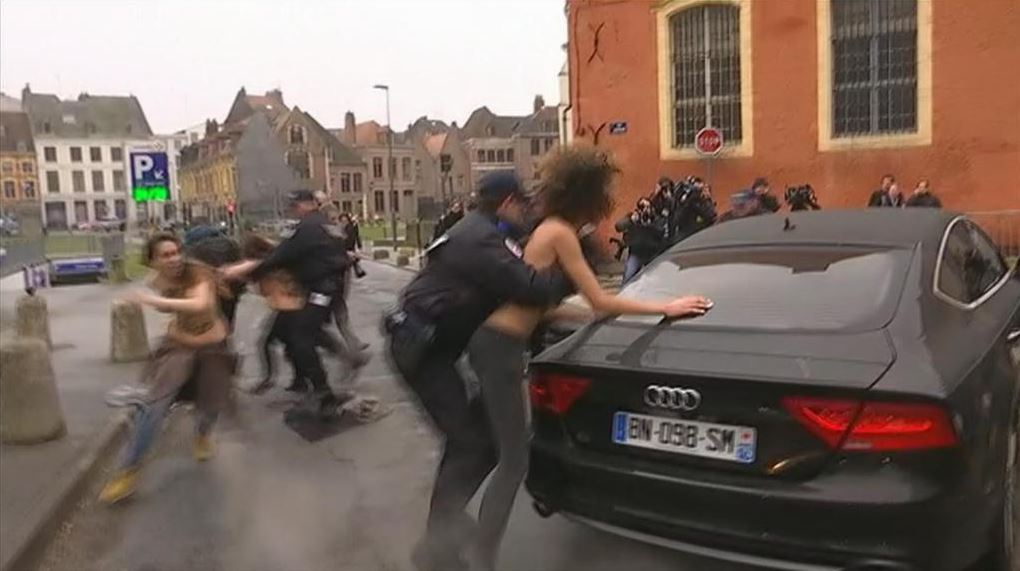Φωνάζοντας “μαστροποί-πελάτες να κηρυχθούν ένοχοι”, οι τρεις ακτιβίστριες αιφνιδίασαν τους αστυνομικούς που είχαν πάρει θέσεις μπροστά από το δικαστήριο και μία εξ αυτών σκαρφάλωσε στο καπό του αυτοκινήτου με τα σκούρα τζάμια που μετέφερε τον Ντομινίκ Στρος-Καν, ενώ οι δύο άλλες στάθηκαν γύρω από το αυτοκίνητο, πριν τεθούν όλες υπό κράτηση.