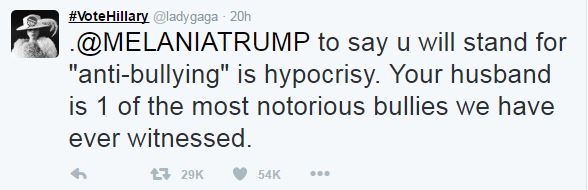 «Μελάνια Τραμπ το να λες ότι θα δώσεις μάχη για να καταπολεμήσεις το bullying είναι υποκρισία. Ο σύζυγός σου είναι ο πρώτος από τους πιο διαβόητους νταήδες που έχουμε δει ποτέ» έγραψε η Lady Gaga στο Twitter.