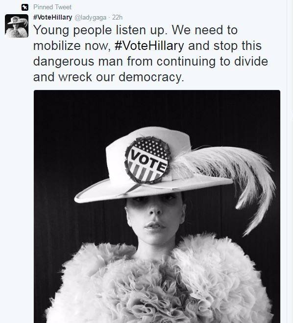 Σε μία άλλη ανάρτηση της η pop star ζήτησε από τους Αμερικανούς να ψηφίσουν την Χίλαρι Κλίντον στις εκλογές για την προεδρία των ΗΠΑ.