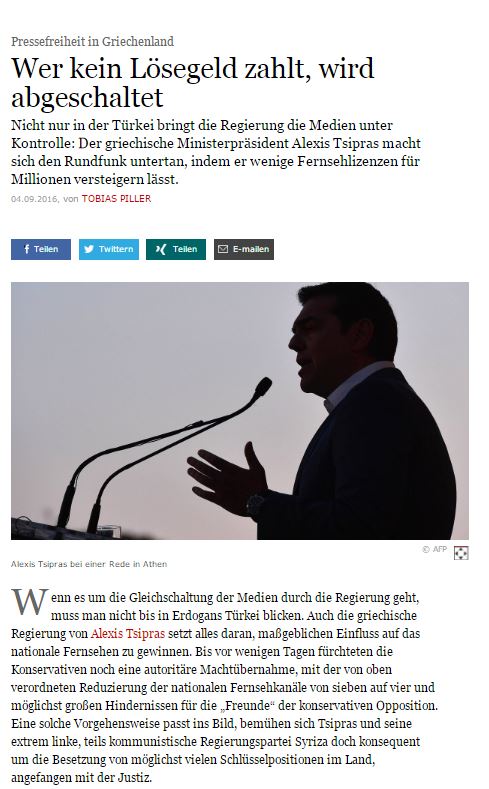 Η γερμανική εφημερίδα Frankfurter Allgemeine Zeitung, με δημοσίευμα της, συγκρίνει τους χειρισμούς της κυβέρνησης του Τσίπρα, σχετικά με τις τηλεοπτικές άδειες με αυτούς του Ερντογάν με τα τουρκικά μέσα Ενημέρωσης.