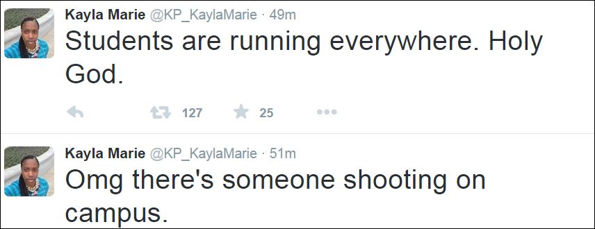 «Θεέ μου, κάποιος πυροβολεί στο πανεπιστήμιο» έγραψε η φοιτήτρια Kayla Marie στο twitter μόλις άκουσε τους πυροβολισμούς.