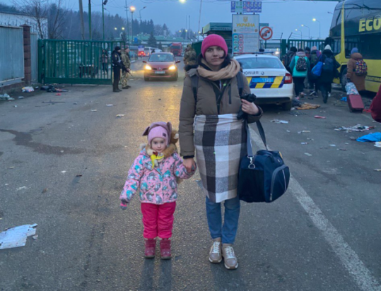 «Ευχαριστώ κ. Πούτιν για μια τέτοια αλλαγή στη ζωή μου, από επαγγελματίας δημοσιογράφος σε πρόσφυγας από τη μεγαλύτερη χώρα της Ευρώπης», γράφει η Sofia Koczmar. Στη φωτογραφία κρατά από το χέρι την κόρη της.