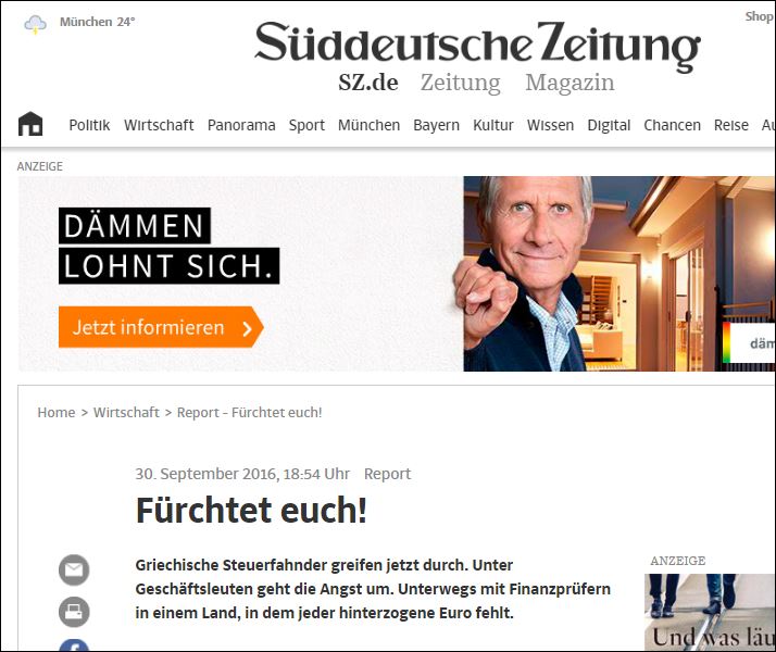 «Να φοβάστε!». Με αυτόν τον επιθετικό τίτλο δημοσιεύεται ρεπορτάζ στην εφημερίδα Süddeutsche Zeitung. Η πρόταση που ακούγεται σαν απειλή απευθύνεται στους Έλληνες φοροφυγάδες. Στο εκτενές άρθρο αναφέρονται με λεπτομέρειες οι εξελίξεις στο κυνήγι της φοροδιαφυγής στην Ελλάδα. «Πολλές φορές λέγεται ότι οι Έλληνες πολιτικοί δεν θέλουν να ελέγξουν τη φοροδιαφυγή. Όμως εδώ και μερικούς μήνες το κλίμα έχει αλλάξει. Οι ελεγκτές επεμβαίνουν με συνέπεια ενώ στους καταστηματάρχες κυριαρχεί ο φόβος».