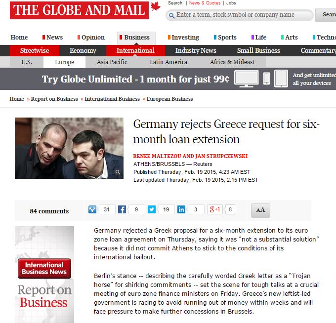 Σε δισέλιδο αφιέρωμα στη σημαντικότερη, από πλευράς πολιτικής και οικονομικής επιρροής, εφημερίδας του Καναδά, της Globe and Mail φιλοξενούνται τέσσερα ρεπορτάζ -τα δύο από Ευρώπη- σχετικά με το ελληνικό ζήτημα και την κατάσταση στην ευρωζώνη.
