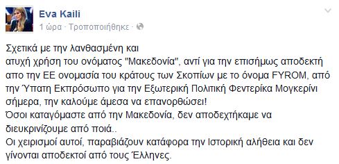 «Σχετικά με την λανθασμένη και ατυχή χρήση του ονόματος “Μακεδονία”, αντί για την επισήμως αποδεκτή απο την ΕΕ ονομασία του κράτους των Σκοπίων με το όνομα FYROM, από την Ύπατη Εκπρόσωπο για την Εξωτερική Πολιτική Φεντερίκα Μογκερίνι σήμερα, την καλούμε άμεσα να επανορθώσει!