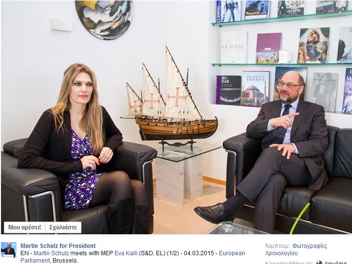 Συνάντηση με τον Πρόεδρο του Ευρωπαϊκού Κοινοβουλίου, Μάρτιν Σουλτς, είχε σήμερα η ευρωβουλευτής Εύα Καϊλή, προκειμένου να διαμαρτυρηθεί για την αντιπρόεδρο της Κομισιόν Φεντερίκα Μογκερίνι, η οποία αποκάλεσε τα Σκόπια “Μακεδονία”. Μάλιστα, η Εύα Καϊλή στον προσωπικό της λογαριασμό στο Facebook ζήτησε από την Ύπατη Εκπρόσωπο για την Εξωτερική Πολιτική, να επανορθώσει.