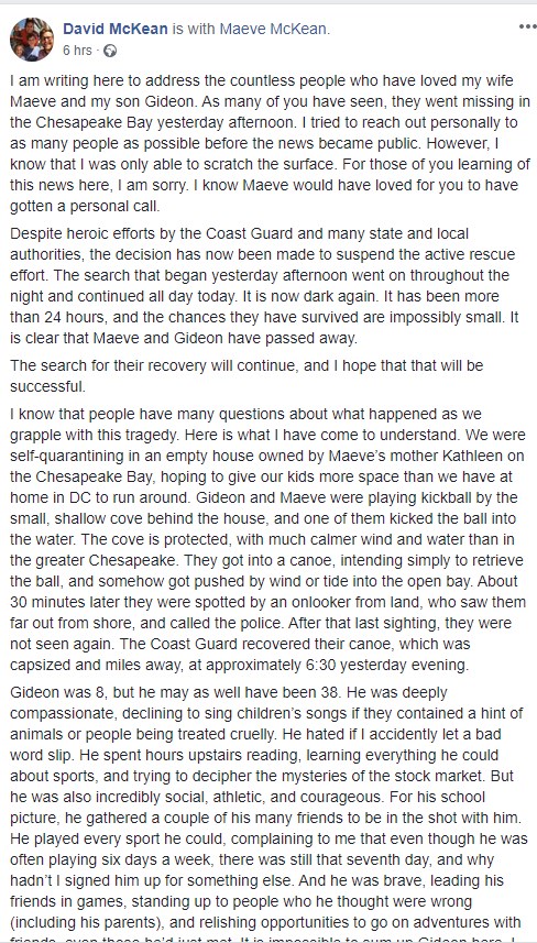 “Όπως έχει δει εξαφανίστηκαν στο Chesapeake Bay προχθές το απόγευμα. Παρά τις ηρωικές προσπάθειες της ακτοφυλακής και των τοπικών αρχών, η απόφαση λήφθηκε να σταματήσει η επιχείρηση διάσωσης. Έχουν περάσει 24 ώρες και οι πιθανότητες να βρεθούν ζωντανοί είναι εξαιρετικά μικρές. Είναι ξεκάθαρο ότι η σύζυγος και ο γιος που πέθαναν. Η προσπάθεια ανεύρεσης των σωμάτων τους θα συνεχιστεί και ελπίζω να είναι πετυχημένη. Ξέρω ότι θα έχετε πολλές ερωτήσεις ενώ προσπαθούμε να κατανοήσουμε αυτή την τραγωδία. Ήμασταν σε αυτο-καραντίνα στο άδειο σπίτι της μητέρας της Maeve για να έχουν τα παιδιά περισσότερο χώρο από ότι στην Ουάσινγκτον. Οι δυο τους έπαιζαν ποδόσφαιρο και η μπάλα έπεσε στο νερό. Ο κολπίσκος μπροστά στο σπίτι είναι προστατευμένος και πιο ήρεμος από τον υπόλοιπο κόλπο. Μπήκαν σε ένα κανό, αλλά κάπως ο άνεμος τους έσπρωξε στα ανοιχτά. Η ακτοφυλακή βρήκε το κανό μίλια μακριά.