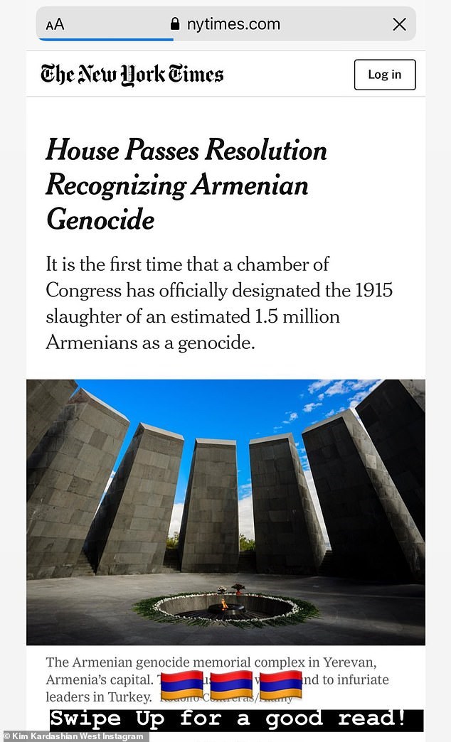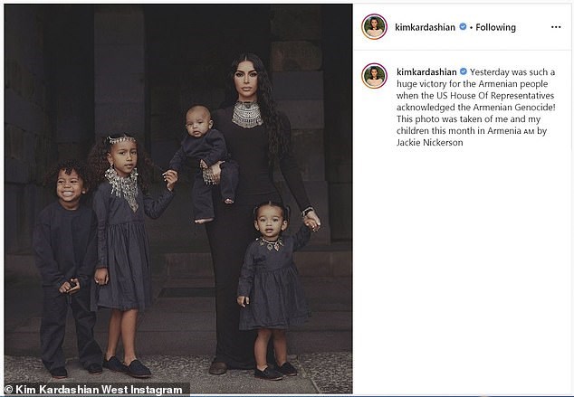 Με αφορμή την αναγνώριση από τη Βουλή των Αντιπροσώπων των ΗΠΑ της Γενοκτονίας των Αρμενίων, η τηλεπερσόνα το γιόρτασε με μία καθηλωτική φωτογραφία της στο instagram όπου ποζάρει με τα παιδιά της κατά την επίσκεψή της στην πατρίδα των προγόνων της.