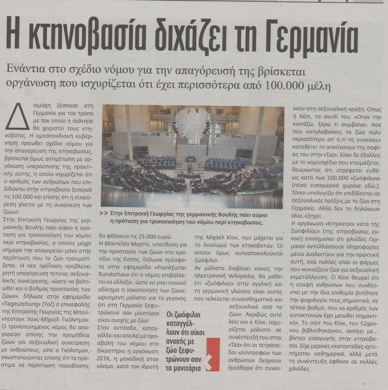 Στην επιτροπή Γεωργίας της γερμανικής Βουλής πάει αύριο η πρόταση για τροποποίηση του νόμου περί κτηνοβασίας, ο οποίος μέχρι σήμερα την απαγορεύει μόνο στην περίπτωση που το ζώο τραυματίζεται. Η νέα πρόταση προβλέπει ρητή απαγόρευση τέτοια σεξουαλικής συνεύρεσης, “ώστε να βελτιωθεί και ο βαθμός προστασίας των ζώων”, δήλωσε στην εφημερίδα “Tageszeitung” (Tαζ) o επικεφαλής της Επιτροπής Γεωργίας της Μπούντεστανγκ Χανς-Μίχαελ Γκόλντμαν.