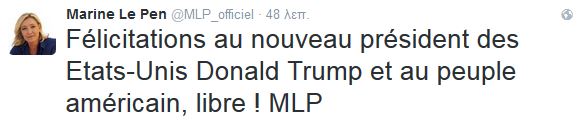 Η επικεφαλής της γαλλικής ακροδεξιάς Μαρίν Λεπέν συνεχάρη μέσω του Twitter «τον νέο πρόεδρο των Ηνωμένων Πολιτειών Ντόναλντ Τραμπ και τον ελεύθερο αμερικανικό λαό».