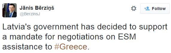 Η κυβέρνηση της Λετονίας αποφάσισε να στηρίξει την εντολή διαπραγμάτευσης με τον ESM για την διάσωση της Ελλάδας.
