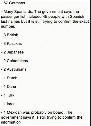 Τη λίστα με τις εθνικότητες των επιβατών του μοιραίου αεροσκάφους της Germanwings που συνετρίβη στις γαλλικές Άλπεις δημοσίευσε το AirLive.net
