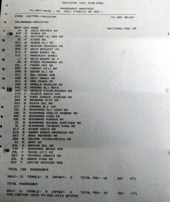 Νωρίτερα κυβερνητικός αξιωματούχος δήλωσε στο Reuters ότι είναι πολύ δύσκολο να υπάρχουν επιζώντες. Σύμφωνα με τα διεθνή ΜΜΕ, μεταξύ των επιβατών ήταν ο διάσημος τραγουδιστής του Πακιστάν, Junaid Jamshed μαζί με τη σύζυγό του.