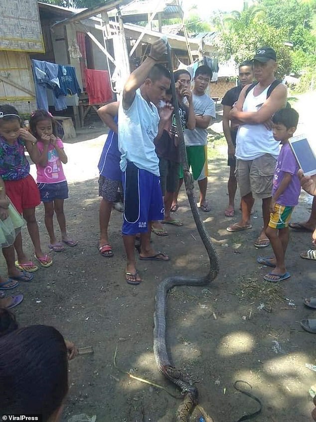 Οι τρομοκρατημένοι κάτοικοι μόλις είδαν την κόμπρα άρχισαν να την χτυπούν με ξύλα μέχρι που την σκότωσαν. Η ουρά του τεράστιου πύθωνα που είχε σκοτώσει και καταβροχθίσει εξήχε από το στόμα της κόμπρας.