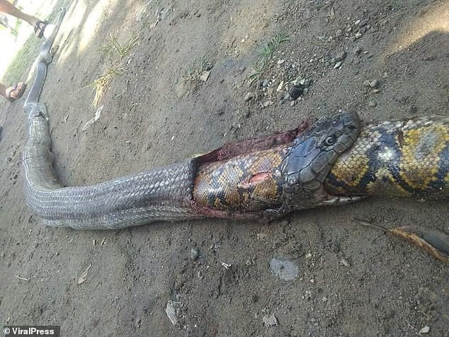 “Υπάρχουν πολλά φίδια στην περιοχή μας αλλά είναι η πρώτη φορά που είδαμε κόμπρα να έχει φάει πύθωνα” είπε ένας κάτοικος.