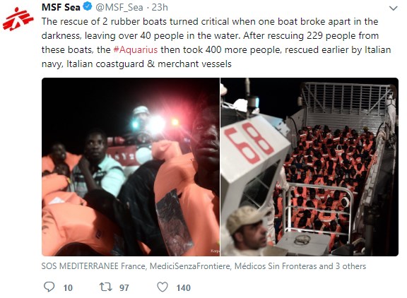 «Η Μάλτα δεν υποδέχεται κανέναν. Η Γαλλία απωθεί ανθρώπους στα σύνορα. Η Ισπανία υπερασπίζεται τα σύνορά της με τα όπλα», έγραψε ο Σαλβίνι στον ιστότοπο κοινωνικής δικτύωσης Facebook. «Από σήμερα, η Ιταλία επίσης αρχίζει να λέει όχι στην εμπορία ανθρώπων, όχι στην επιχειρηματική δραστηριότητα της παράνομης μετανάστευσης».