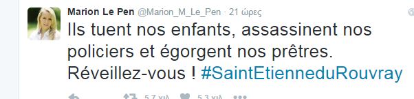 Νωρίτερα, σε άλλη ανάρτηση της και πάλι στο Twitter είχε γράψει: Σκοτώνουν τα παιδιά μας. Δολοφονούν τους αστυνομικούς μας και σφάζουν τους ιερείς μας. Ξυπνήστε».