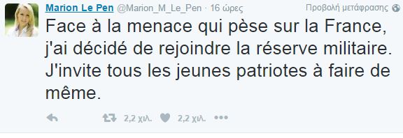 «Εξαιτίας της απειλής που αντιμετωπίζει η Γαλλία, αποφάσισα να ενταχθώ στον εφεδρικό στρατό. Καλώ όλους τους νέους πατριώτες να κάνουν το ίδιο», έγραψε στον προσωπικό της λογαριασμό στο Twitter η Μαριόν Λεπέν.