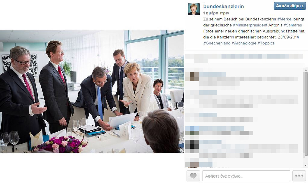 Για τα καλά, όμως, φαίνεται πως έχει μπει στο πνεύμα του Instagram η Γερμανίδα καγκελάριος, αφού μέσα σε μιάμιση μέρα έχει ανεβάσει 46 φωτογραφίες, μία από τις οποίες είναι μαζί με τον πρώην πρωθυπουργό της Ελλάδας και πρόεδρο της Νέας Δημοκρατίας, Αντώνη Σαμαρά. Μάλιστα, η κα Μέρκελ έχει σχολιάσει πως η φωτογραφία είναι από επίσκεψη του κ. Σαμαρά, στις 23 Σεπτεμβρίου του 2014, και πως της δείχνει φωτογραφίες από μία αρχαιολογική ανασκαφή, τις οποίες η ίδια παρατήρησε με ενδιαφέρον.
