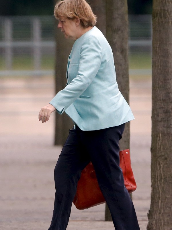 Η Άνγκελα Μέρκελ περπατάει σκυφτή και δείχνει απογοητευμένη. Υπενθυμίζεται ότι το απόγευμα η Καγκελάριος θα βρίσκεται στο Παρίσι για το δείπνο με τον Φρανσουά Ολάντ, στο οποίο θα συζητηθεί το ελληνικό ζήτημα.