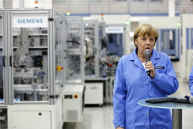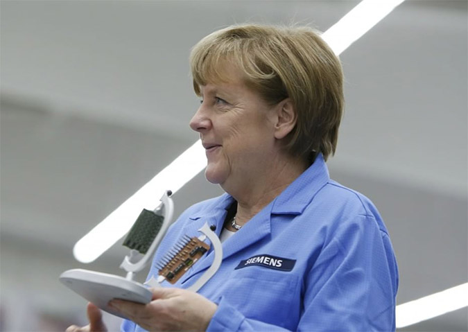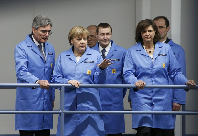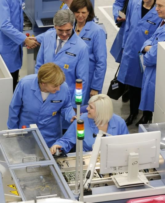 Έχοντας στο πλευρό της τον CEO της Siemens, Τζο Κέσερ, ξεναγήθηκε στις εγκαταστάσεις του συγκεκριμένου εργοστασίου στη βαυαρική πόλη Άμπεργκ, που απασχολεί 1.200 εργάτες και βραβεύθηκε ως το «Εργοστάσιο της Χρονιάς».