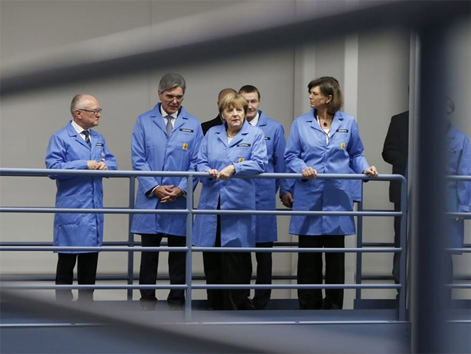 Όχι για τις απόκριες, αλλά στο πλαίσιο επίσκεψής της σε εργοστάσιο της Siemens, η Γερμανίδα καγκελάριος Άνγκελα Μέρκελ, ντύθηκε με τη γαλάζια στολή που φορούν οι εργάτες της εταιρείας.