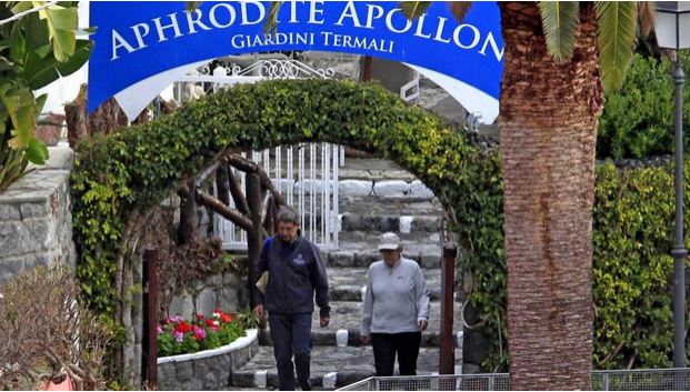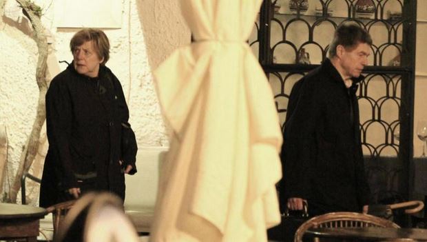 Ο φωτογραφικός φακός συνέλαβε μάλιστα τη Μέρκελ, συνοδευόμενη από τον σύζυγό της, να επισκέπτεται τα ιαματικά λουτρά του νησιού «Afrodite Apollon».