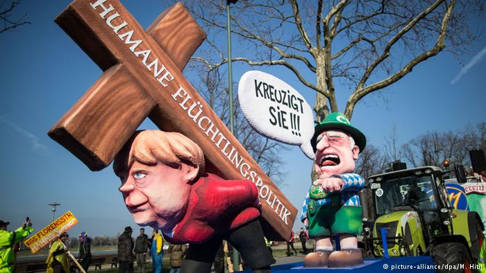 Οι καρναβαλιστές αποφάσισαν, συγκεκριμένα, να παρουσιάσουν την Καγκελάριο της Γερμανίας ως έναν άλλον Χριστό που έρχεται να κουβαλήσει τον σταυρό του προσφυγικού, την ίδια ώρα που το πλήθος ζητωκραυγάζει: «Σταυρώστε την».