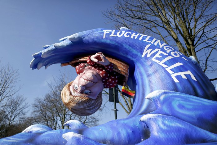 Ένα άλλο άρμα απεικόνιζε την Γερμανίδα πολιτικό να πνίγεται στην θάλασσα των προσφύγων.
