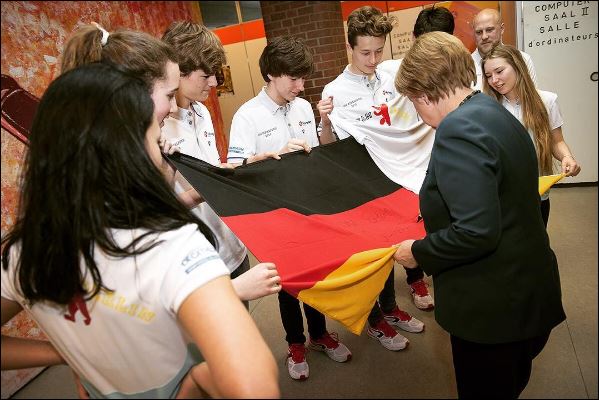 Oι μαθητές πλησιάζουν την κ. Μέρκελ και εκείνη για να τους ευχαριστήσει άλλοτε φωτογραφίζεται μαζί τους και άλλοτε υπογράφει πάνω στη γερμανική σημαία.