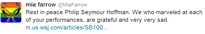 Την οδύνη της εξέφρασε η διάσημη ηθοποιός Mia Farrow για τον θάνατο του συναδέλφου της Philip Seymour Hoffman. Στο πολύ συγκινητικό μήνυμα που έγραψε στο twitter σημειώνει: