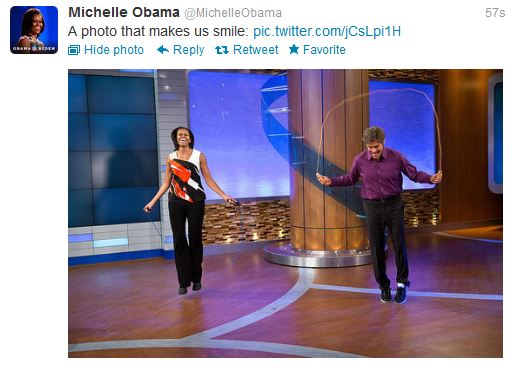 Μπορεί να είναι η πρώτη κυρία των Ηνωμένων Πολιτειών, αλλά απ’ότι φαίνεται, δεν βγάζει το παιδί από μέσα της.Η Michelle Obama, ”ανέβασε” στον λογαριασμό της στο twitter μία φωτογραφία, τη στιγμή που κάνει σχοινάκι.